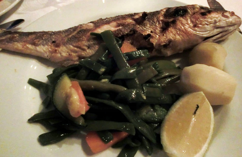 De verrassing op de kaart! De vangst van de dag was gegrilde zeebaars. Doordat de vis op de huid gezouten en gegrild wordt blijft de vis zacht en goed van smaak. Een simpel gerecht maar kwalitatief heel goed en vooral extreem vers.