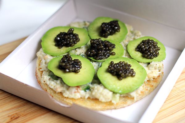 Bij Le Petit Bistro, grenzend aan restaurant Bridges in hotel The Grand, aten we deze twee kleine ‘pizza’s’ (geserveerd in een klein papieren pizzadoosje), enerzijds belegd met zalm en crème fraîche, anderzijds met krab, avocado en kaviaar. De bodem bestaat uit wit brood, gebakken in beurre noisette (lékker!).