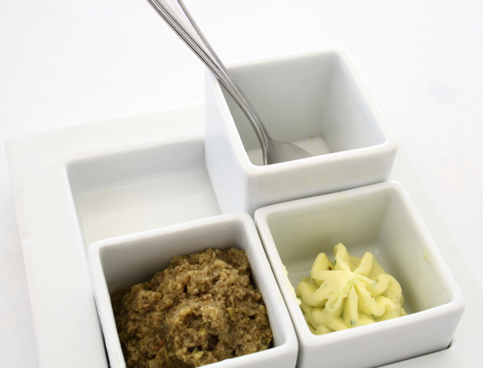 Brood wordt geserveerd met zeezout, kruidenboter en olijventapenade