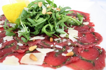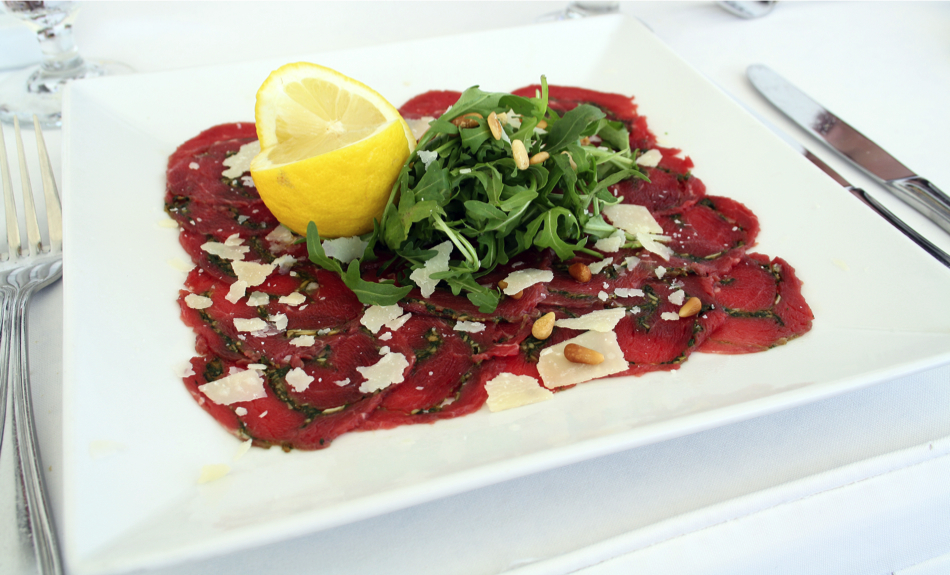 Kruide beef carpaccio met olijfolie, Parmezaanse kaas, pijnboompitjes en citroen