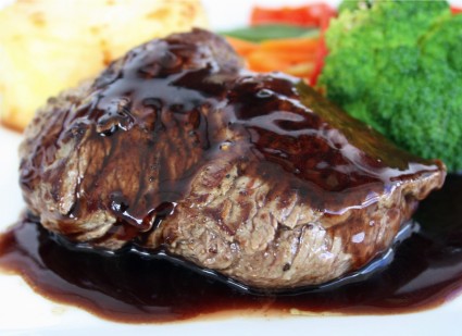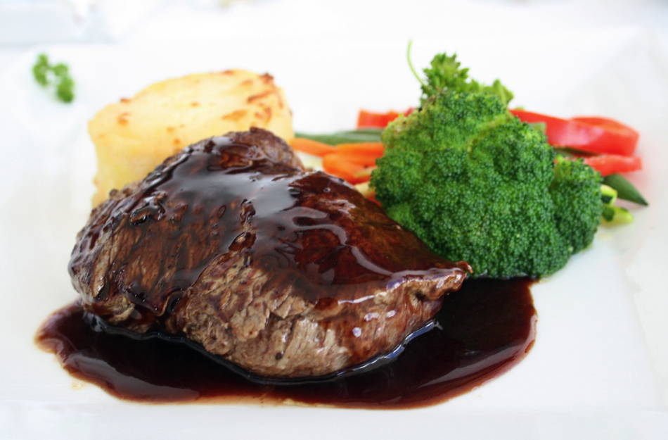 Klassieke biefstuk met rode wijn saus, aardappelgratin en groenten
