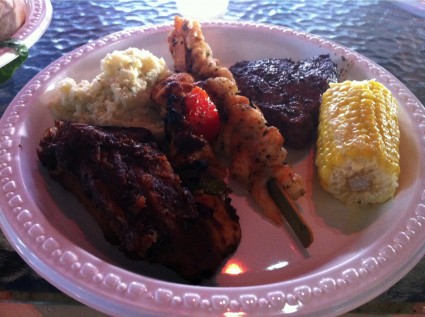 Barbecue op het strand; goed leven kan soms zo simpel zijn….! Op Curaçao eet je veel vis en vlees, zoals deze gespieste garnalen, gemarineerde biefstuk en zoete spareribs. Vaak worden dit soort gerechten geserveerd met aardappelpuree (die ze nog vaak willen aanmaken met veel kaas!) en maiskolven,