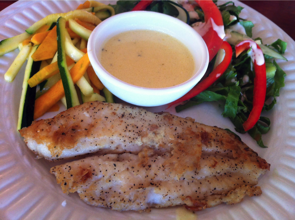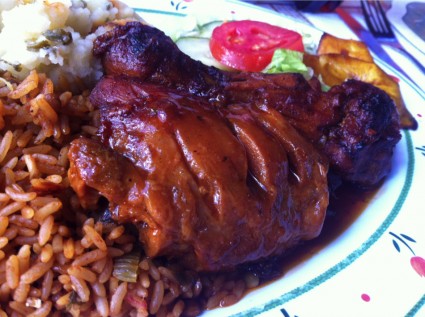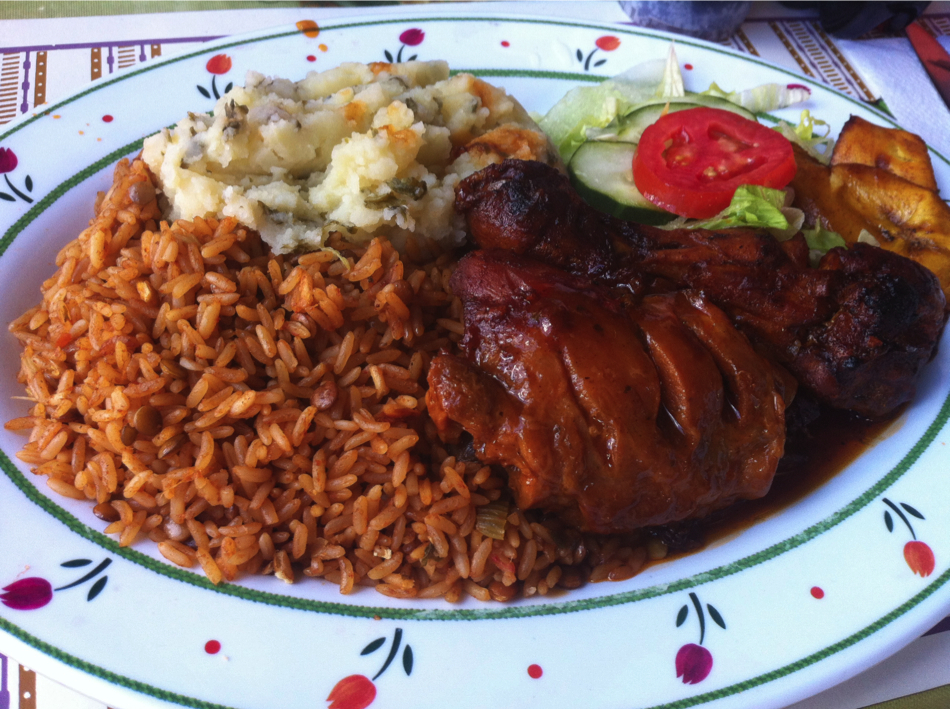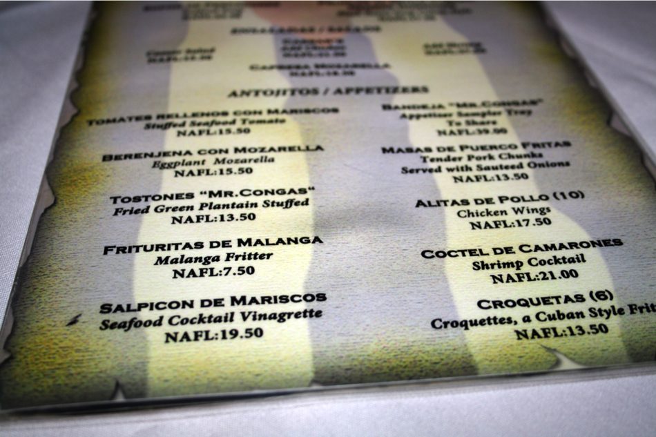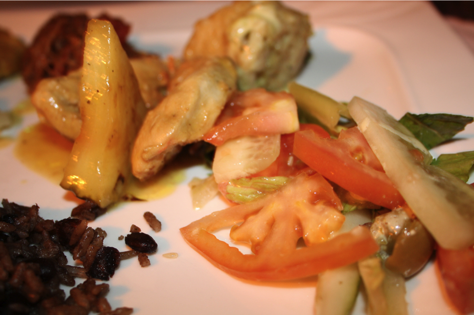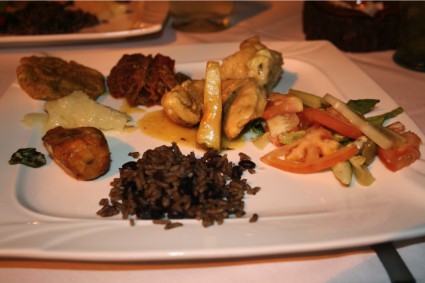 Diner bij Mr Congas. Onder het genot van lekkere live-muziek genieten we van local food zoals het hoort te zijn. Zo aten we er bruine rijst met linzen, kip met gegrilde ananas en zoete saus, stoofvlees, cassave, opgerolde witvis met garnalen. Ook de toetjes waren niet mis: de kokos flan is een specialiteit uit Curaçao.