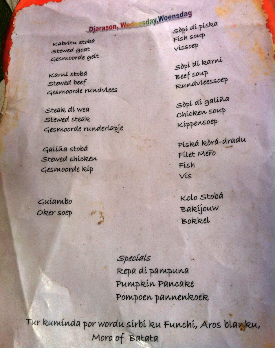 Yvonne di Plaza in Willemstad, vlakbij de Floating Market. Hier kun je lunchen op de local manier! Verwacht niks sjieks, maar wel erg lekker eten. Er zijn verschillende keukens, wij aten bij ‘die van Yvonne’. Goede, super smaakvolle gerechtjes zonder poespas. Je betaalt er ongeveer 10 dollar voor een gerecht met bijvoorbeeld kip, bruine rijst, aardappelpuree, groenten en gebakken banaan (die laatste is zeker een aanrader!). Ook geitenvlees is hier een specialiteit.