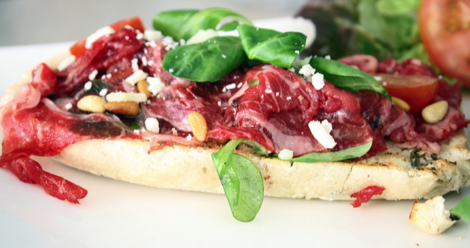 - CIABATTA RIB-EYE: Gerookte runder rib eye carpaccio met gepofte tomaat, Pecorino kaas, rucola & truffelvinaigrette