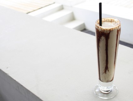 Als toetje een ‘ijskoffie’, hier gemaakt met karamelsaus en roomijs.