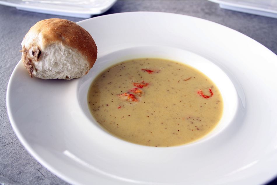 Vooraf aten we een pittige mosterdsoep met homemade gebakken brood.