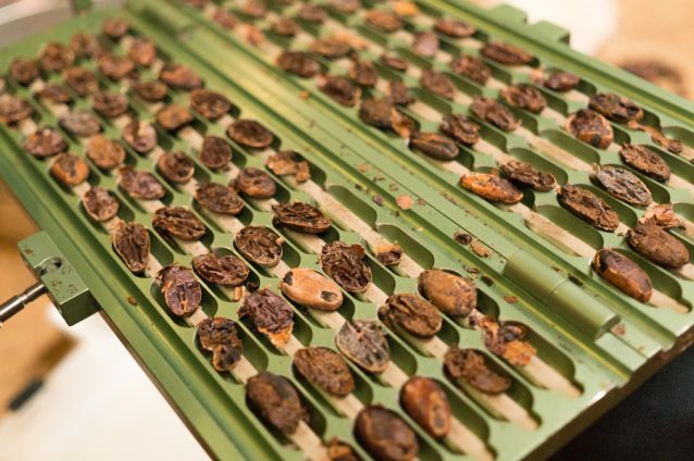 Ook een manier om te testen is de ‘cutting test’: door de bonen doormidden te snijden, kun je zien of ze goed gefermenteerd zijn. De boontjes worden stuk voor stuk in een houder gelegd die wordt gesloten, daarna jassen ze er fluks een mes doorheen, bijna zoals een guillotine. “Wij hebben de guillotine, maar in Afrika op de plantages doen ze dit met de hand”, aldus Luuk.