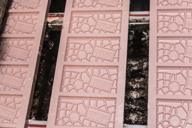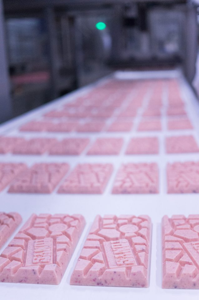 De vloeibare chocolade gaat via een slang in de machine waar er ingrediënten bij komen. In dit geval: frambozen en knettersuiker! Dat wordt in een mal gegoten, die wordt getrild om de chocolade mooi uit te spreiden over de vorm. De chocolade gaat snel door een koeltunnel om op te stijven. Daarin wordt de reep bewogen zodat ‘ie mooi uitspreidt.
