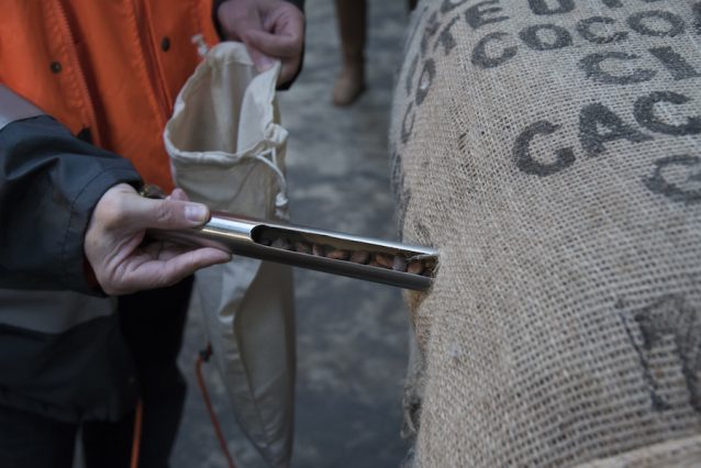 Opvallend zijn de enorme bergen hoog opgestapelde zakken cacaobonen in de chocoladefabriek. In één zak zit tussen de 60 en 70 kilo bonen, afhankelijk van de boon. Met metalen stokken waar een gleuf in zit, wordt in de zakken geprikt om samples van de bonen te krijgen.
