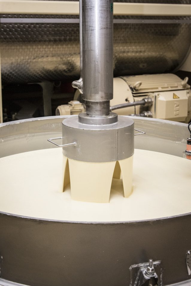 De geur van chocolade slaat ons inmiddels om de oren, want we komen terecht bij de productielijnen voor de chocolade. De grondstoffen worden gemengd in een mixer: de cacaomassa, suiker en melkpoeder.