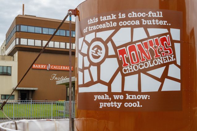 In de fabriek staat een aparte tank, speciaal voor Tony’s traceerbare cacaoboter. Er zit zelfs een enorme Tony’s-sticker op, dus niet te missen. “Ja, je mag ‘m knuffelen!”, zegt Xavier, de directeur van de chocoladefabriek.