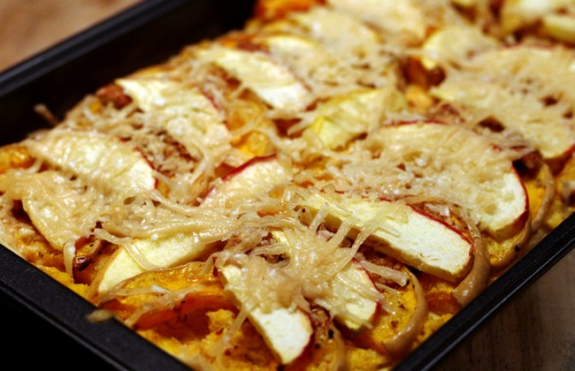 Pompoenlasagne met appeltjes, amandelen en Parmezaanse kaas