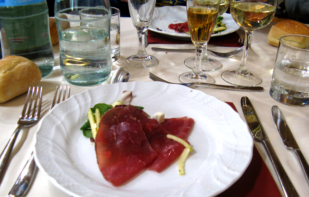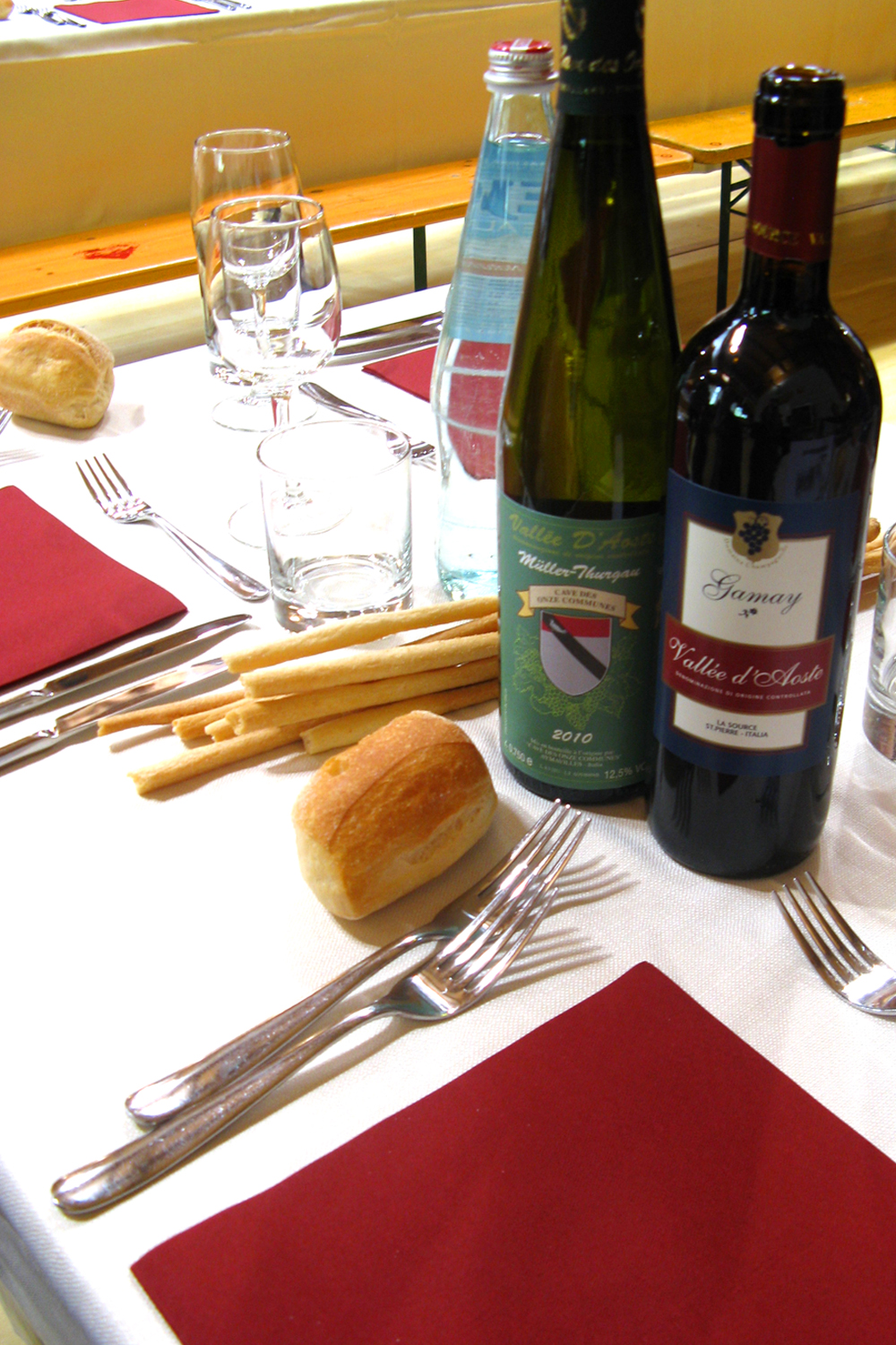 Toen we binnenkwamen kregen we meteen een glaasje appelcider in onze handen. Uiteraard een rode en een witte wijn, tijdens de lunch, uit Aosta.