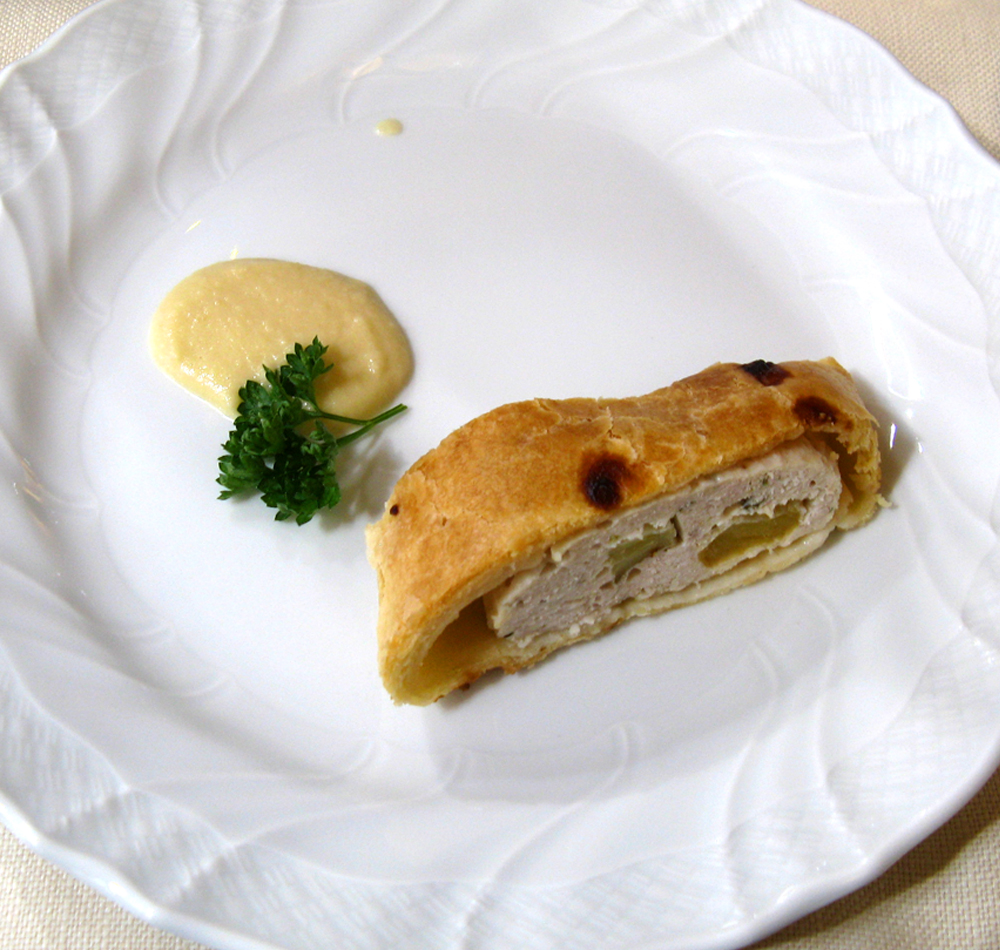 Dit is kalkoen met daarin appel verwerkt, in een bladerdeegjasje. De kalkoen was heel stevig van textuur, niet droog en de smaak van de kalkoen gecombineerd met de stukjes appel erin was verrassend lekker. Ernaast lag een sausje van appel, een soort appelmoes maar dan voller van smaak. Het gerecht werd koud geserveerd.