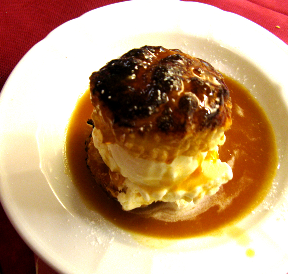 Dit dessert was echt mijn favoriet. Heel zoet maar erg lekker. Het is een top en een bodem van bladerdeeg die gekaramelliseerd zijn, daartussen in zit vanille ijs & slagroom en op het bord eromheen ligt een saus van karamel. Je tanden vielen uit je mond van de zoetigheid, maar zo lekker!