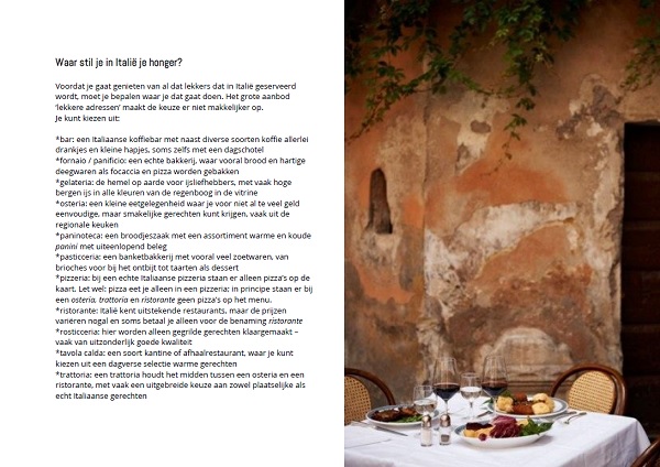 Ik vertel hoe het ook alweer zit tijdens una giornata italiana (wanneer bestel je een cappuccino, wat zijn de gangen van een Italiaanse cena, vergeet niet pasta met alleen je vork te eten…) en wat de lekkerste kaas- en vleessoorten zijn (met voor de liefhebbers ook de specialiteiten met ingewanden). Daarnaast bied ik je woordenlijstjes op elk culinair gebied, zodat je nooit met je mond vol tanden staat, en wijden we je in in wijn en olijfolie, gevolgd door zoeter dan zoete lekkernijen.
