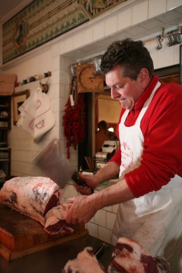 Een omvangrijker vleeswalhalla vind je in Panzano, een van de Chiantidorpjes. Alhoewel, walhalla – als je eigenaar Dario Dante hoort citeren, lijkt het eerder alsof je de hel betreedt. ‘Lasciate ogni speranza o voi che entrate: siete nelle mani di’ macellaio’ – ‘Laat elke hoop varen, gij die hier binnentreedt: jullie zijn in handen van de slager.’ Een slager die als we binnenkomen net het mes in een flink stuk vlees zet. Dat Dario de vijfde generatie van een slagersfamilie komt is duidelijk te merken; de liefde voor het product is hem met de paplepel ingegoten en zit diep, heel diep. ‘Een slager is eigenlijk net een priester,’ zo stelde Dario ooit. ‘Slagers vertegenwoordigen eveneens bloed, leven en vlees. Wij begrijpen het vlees door en door, de zonden die het begaat, de lust die het opwekt…’