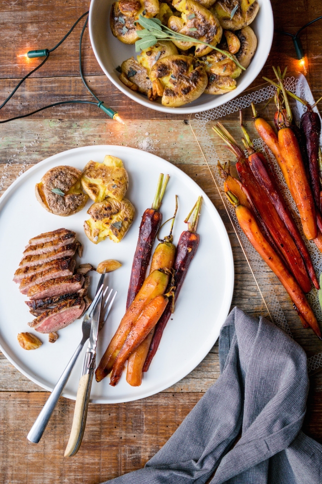 Als hoofdgerecht serveren we gebakken eendenborst, gemarineerd in sinaasappelsap en five spice. Serveer met de perfecte gebakken aardappels en regenboogwortelen met sinaasappel en honing.