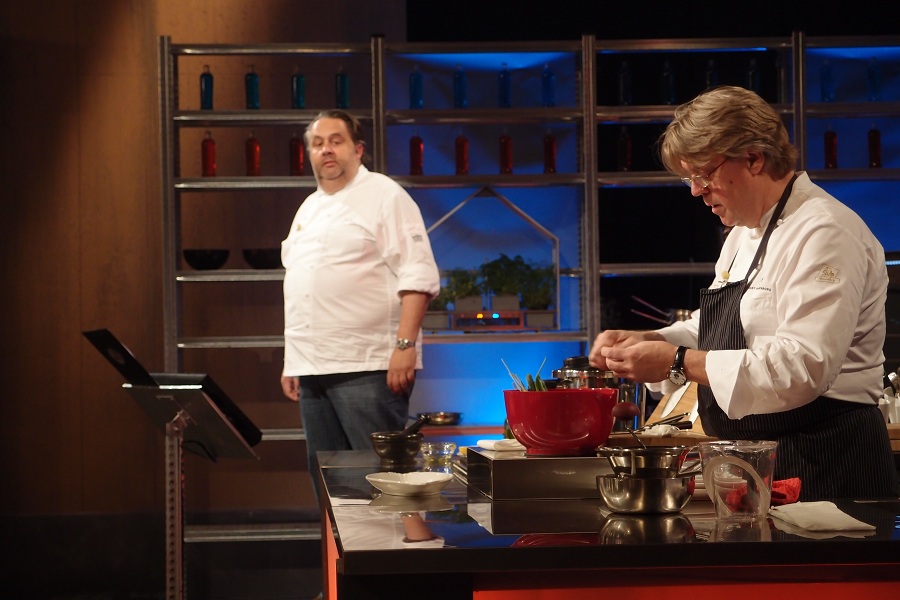 Tijd om de topclass op zich in te laten werken, krijgen de kandidaten niet. Binnen no time heeft de filmploeg iedereen achter een kookeiland geplaatst. Het simultaan koken is intensief: de kandidaten moeten goed luisteren naar de opdracht. Vervolgens moeten ze opletten wat Robert doet en Julius zegt, kunnen ze meekijken op een scherm, maar moeten tegelijkertijd ook zelf koken. En dit is nog maar de derde dag van alle opnamedagen. Julius Jaspers legt uit wat voor druk dit op de kandidaten legt: “Omdat Topchef dagelijks wordt uitgezonden is het opnameschema moordend. Helemaal voor de kandidaten (en Robert en ik), die ook nog ander werk hebben. Ga je naar de finale, dan betekent dat 3 weken vrij nemen bij je baas. Nou, dan hou je wel heel erg van koken.”