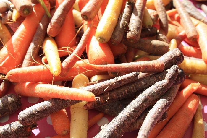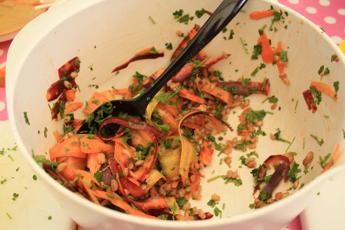 In grote tenten worden kooklessen gegeven. Ik doe mee aan een les over wortels, in alle kleuren van de regenboog. Binnen no time staat er een simpele, maar heerlijke salade op tafel met wortel en noten.