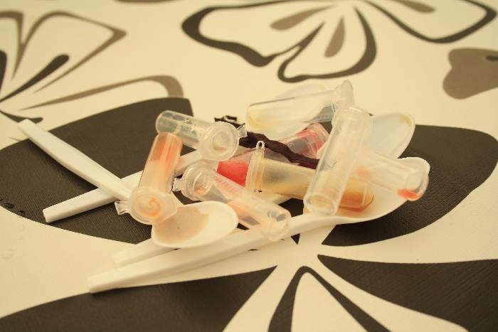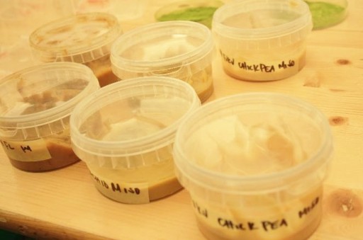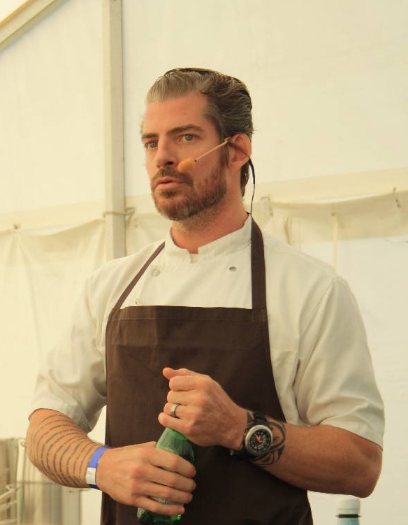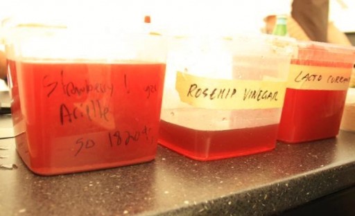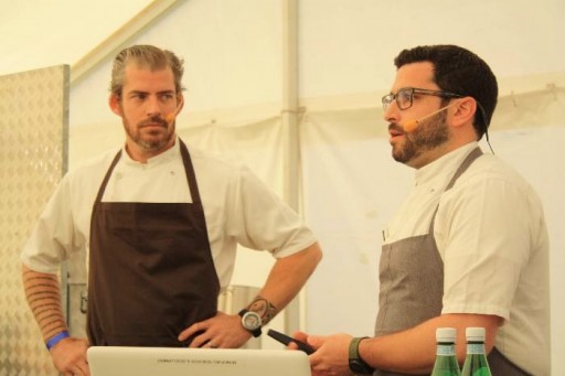 Even verderop staat een tent met lokale wijnproducenten en ook de brouwerijen zijn vertegenwoordigd. Het terrein is onderverdeeld in verschillende area’s: drank, zuivel, groenten en fruit, graanproducten, vlees, vis, workshops, kinderen en horeca. In de workshop area sluiten we aan bij een presentatie van Nordic Food Lab (nordicfoodlab.org) en Momofuku (momofuku.com). Lars Williams (met de tattoo’s) is voor Noma bij Nordic Food Lab continu bezig met het zoeken naar nieuwe smaken en technieken. Hij werk daarvoor samen met Daniel Felder van restaurantketen Momofuku. Ik mag het komende uur proefkonijn zijn.