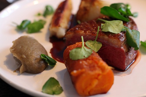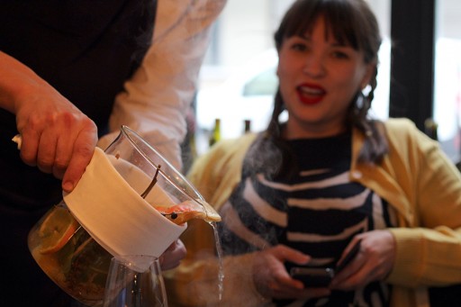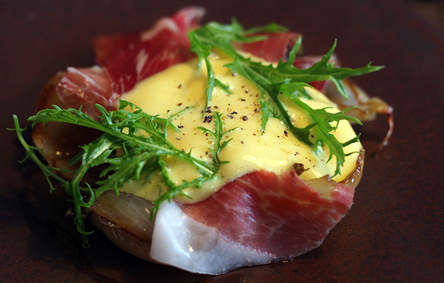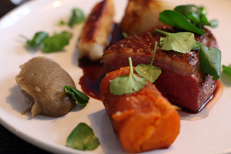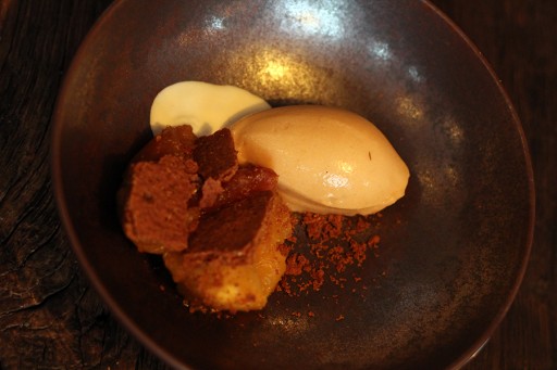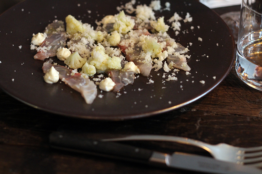 Culy’s Monique neemt als voorgerecht oignon cevenol avec oeuf fumé et noir de Bigorre. Oftewel: gekaramelliseerde ui met schuim van gerookt ei en ham. Een fantastisch gerecht dat eenvoudig oogt, maar qua smaken uit elkaar knalt in je mond. Superbe. Daarna een enorm stuk perfect gegaarde magret de canard (eendenborst) met verschillende groenten en een rode wijnjus. Ohhh. Ook smikkelden we mee bij Rachel: zij bestelde rauwe dorade grise met hele fijne bloemkool (choux-fleur) en mosterd. Als dessert een prachtige perensorbet met appel en een knapperige koekcrumble.