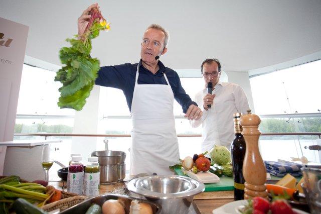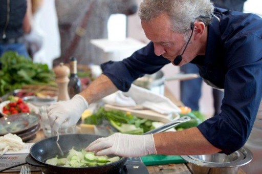 Terwijl de chef groente snijdt, in de pan legt en er – als een schilder dan weer van dichtbij, dan weer van veraf naar kijkt – gaat de presentatie verder. “De groentekeuken kent een grote verscheidenheid aan kleur, smaak, textuur, geur en vorm”, vertelt Alain. “En door zelf je groente te kweken en het ritme van de seizoenen te volgen, kun je naast lekker koken ook nog eens geld besparen.” Maar dat is niet wat de groentechef echt belangrijk vindt. “Gelukkig zijn staat voorop.” En dat is precies wat wij (als amateurchefs) willen horen. Want waarom koop je anders een kookboek…?