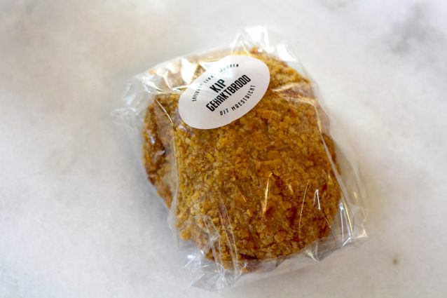 Zoals dat kipgehaktbrood; een klassiek gehaktbrood, maar dan gemaakt van kip. Voor het vlees worden label rouge kippen gebruikt, en verder bevat het gehaktbrood geen water of andere toevoegingen. Wel is het geheel gepaneerd met cornflakes, voor een knapperig korstje. Lekker, zo koud uit het vuistje, in stukjes voor bij de borrel, of snij in plakken voor op een broodje.