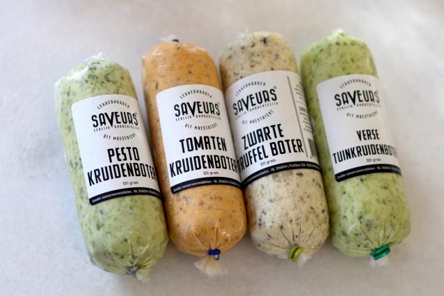 Goede kruidenboters zijn vaak lastig te vinden in de supermarkt of delicatessenwinkel. Saveurs heeft vier soorten: de klassieke verse kruidenboter, pesto boter, zwarte truffelboter en tomatenboter. Allemaal in kleine worstvormpjes verpakt, zo snijd je er makkelijk mooie plakjes van.