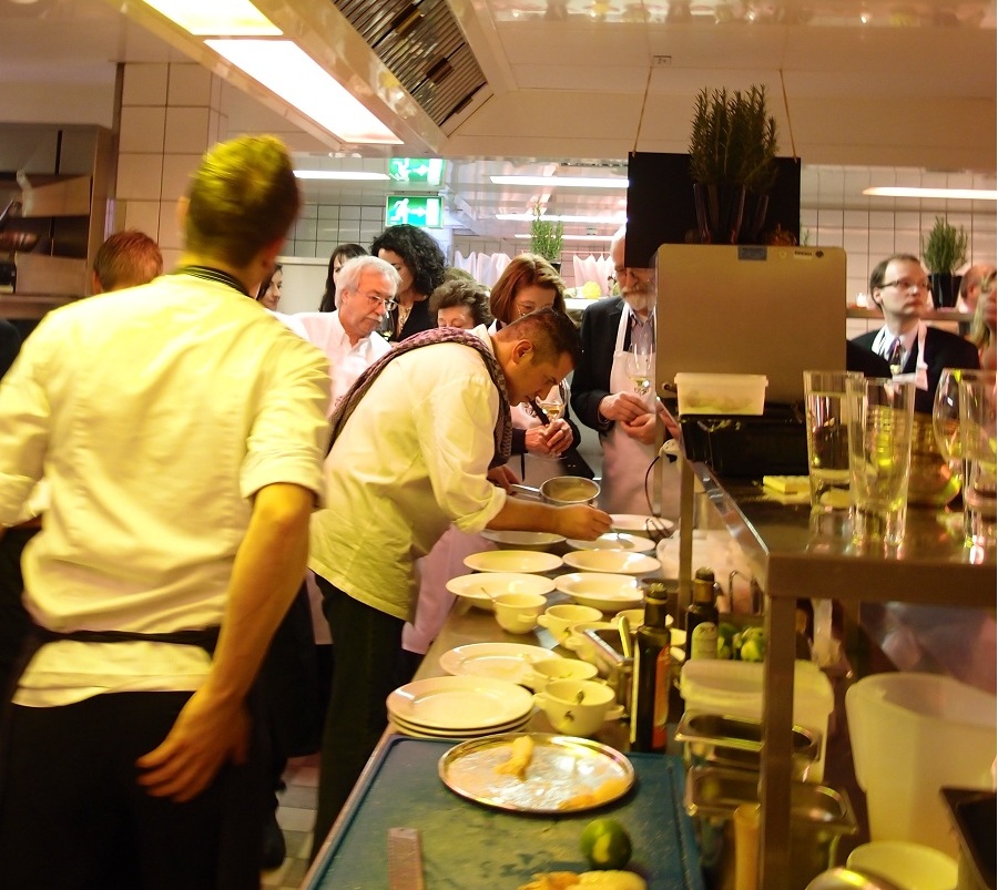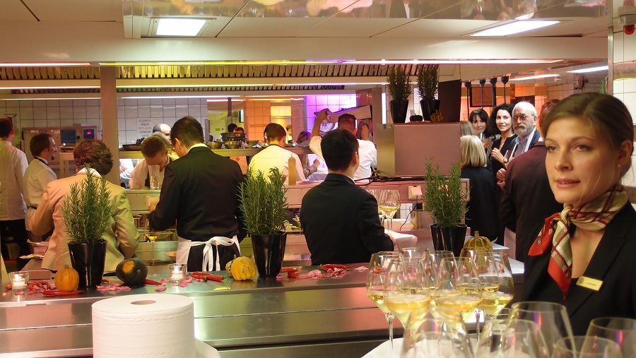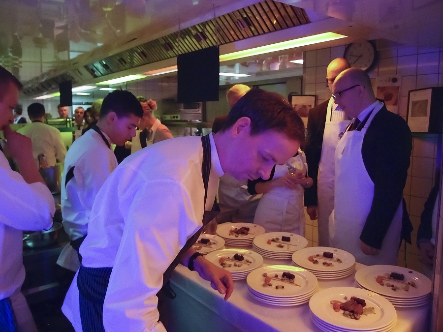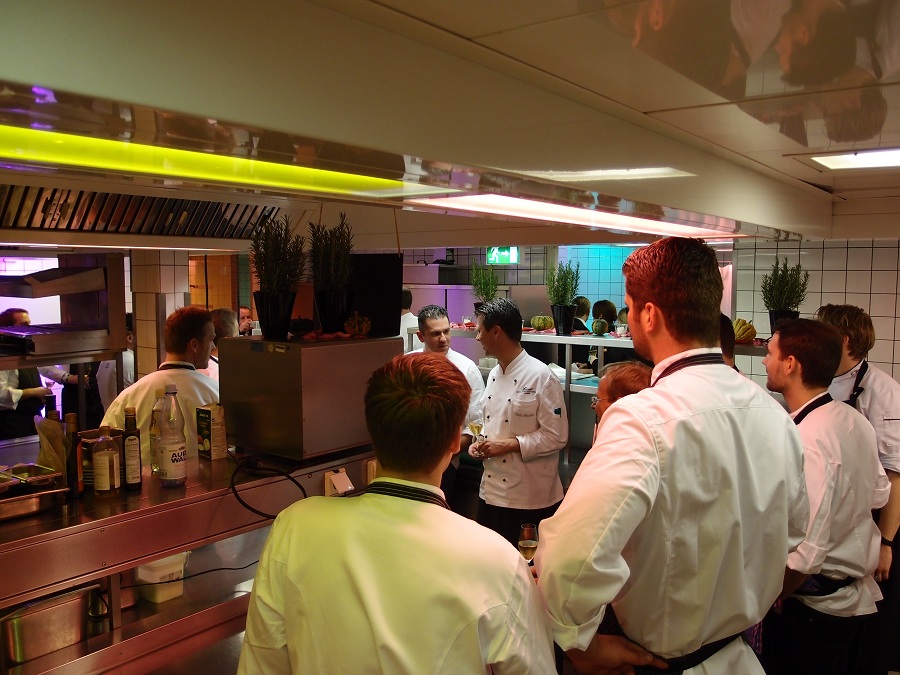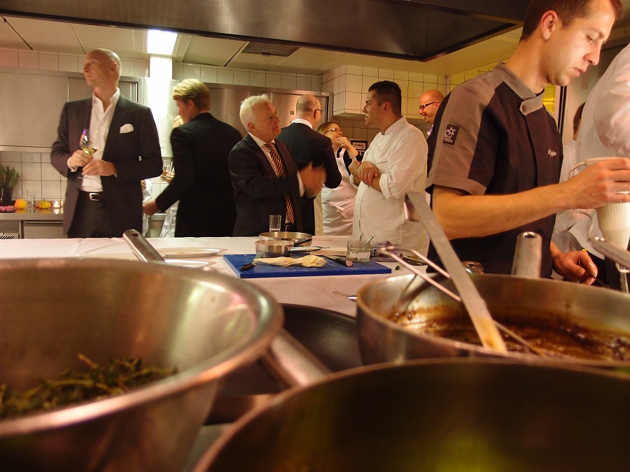 De gasten hebben er zin in. De korte toespraak in de lounge weg helder en – voorzien van een speciaal schort – staan ze nu in de keuken. Want dat is onderdeel van het feest. Iedere chef kun je aanspreken en overal mag je over de schouders van de keukenteams meekijken. Een unieke ervaring. De chefs mogen blij zijn dat ze een team mee hebben genomen, want deze ultieme kans om de chef de buis van het lijf te vragen, grijpen de 200 gasten met beide handen aan. Niet alleen in de keuken, maar ook in de zalen waar de leveranciers staan is het druk. En het geeft de gasten de kans hun menu in te delen zoals ze zelf willen. Kaas vooraf? Dat kan! Even een wijntje tussendoor proeven? Geen probleem! En ook alle gerechten kunnen ze proeven in een volgorde die ze zelf kiezen.