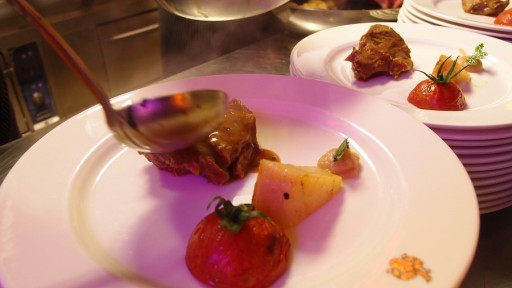 Terwijl de chefs zich voorbereiden, maken ze kennis met elkaar en kletsen ze bij. Want ook voor hen komt het niet vaak voor dat ze in zo’n samenstelling koken. Christoph Rüffer heeft namelijk specifiek deze collega’s uitgenodigd omdat hij onder de indruk van ze is. Je kunt je dus niet opgeven voor dit feest, je moet uitgenodigd worden. Eén van de chefs die zijn Duitse vakbroeder omver wist te blazen, is Jacob Jan Boerma van restaurant De Leest**. En hij is op zijn beurt ook vereerd. Internationaal is zijn ster rijzende en steeds regelmatiger sluit hij aan bij chefs die hem uitnodigen. Zo kookte hij in Portugal bij Vila Joya** en verzorgt hij in november het menu van restaurant Ikarus in Salzburg. Maar voordat het zover is, eerst Hamburg en langoustine met topinambour. Het voltallige personeel van Haerlin staat in de keuken klaar, terwijl de gasten – met speciaal schort – naar binnen lopen.