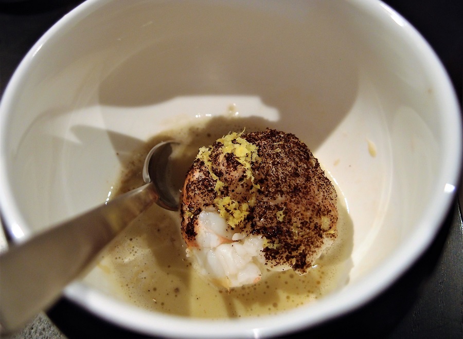 Richard van Oostenbrugge en Thomas Groot (samen Restaurant 212) hadden in een kommetje een gekonfijte langoustine met eendenvet, dashi, koffie en katsobushi gemixt. Smakelijk, vooral vanwege de ontzettend goede garing van de langoustine.