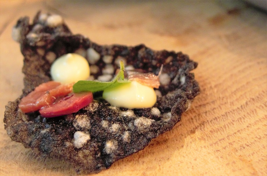 Jarno Eggen serveerde – na een zwart krokantje van inktvisinkt met olijf en jalapeño – kabeljauw met gerookt spek, rode biet en saus ‘Japarto’. In die saus zit onder meer witte wijn en yuzu verwerkt en dat maakt ‘m heel lekker fris.