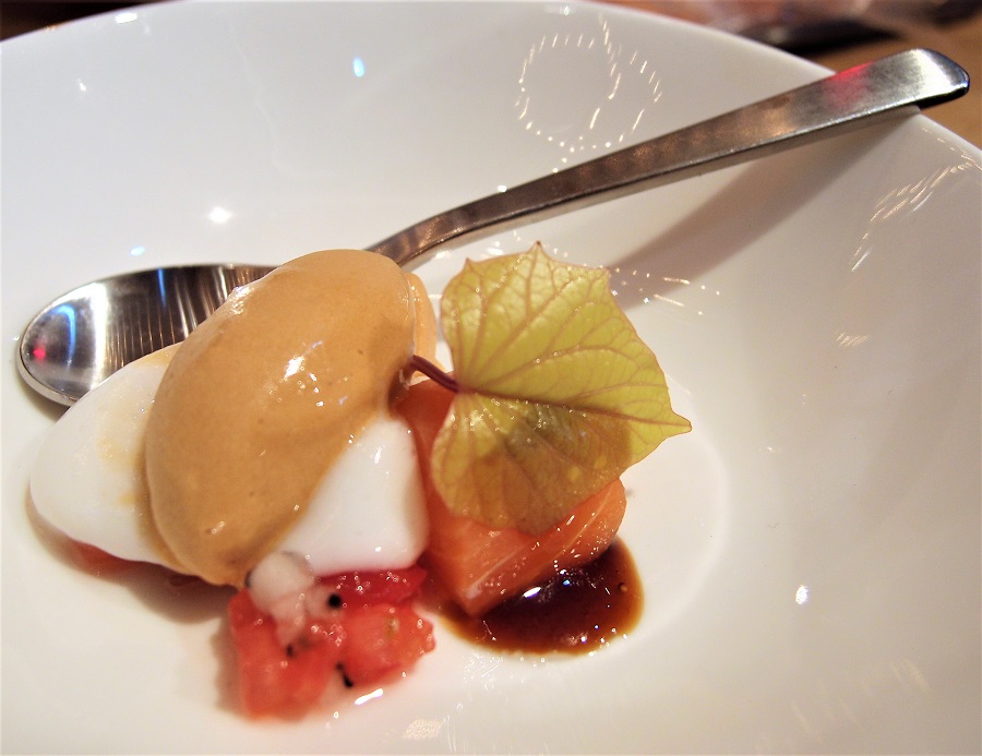 De uitsmijter van de dag was voor ons het gerechtje van Jacob-Jan Boerma. Ponzu-ijs (!) met zalm, watermeloen, een mousse van luchtige sushi-rijst, een terriyaki-vinaigrette en het blad van zoete aardappel. Wij komen graag terug voor editie drie van Dinner at the Parc!
