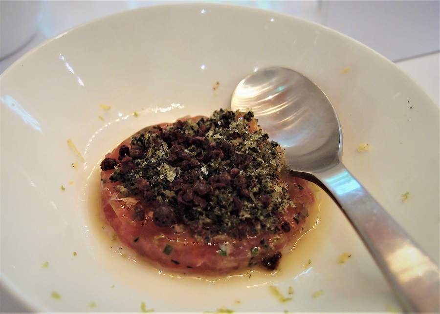 Jan Sobecki serveerde een gerechtje wat er misschien niet meteen heel mooi uitzag, maar wat wel al je smaakpapillen meteen aan het werkt zette. Tonijn met passievrucht en nori. Een heel slimme en heel erg lekkere combinatie van heel uiteenlopende smaken.