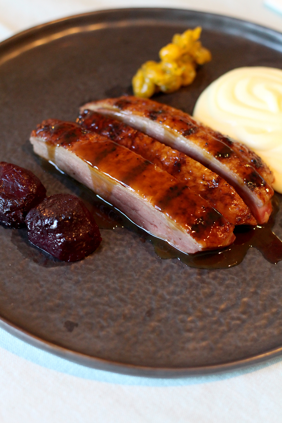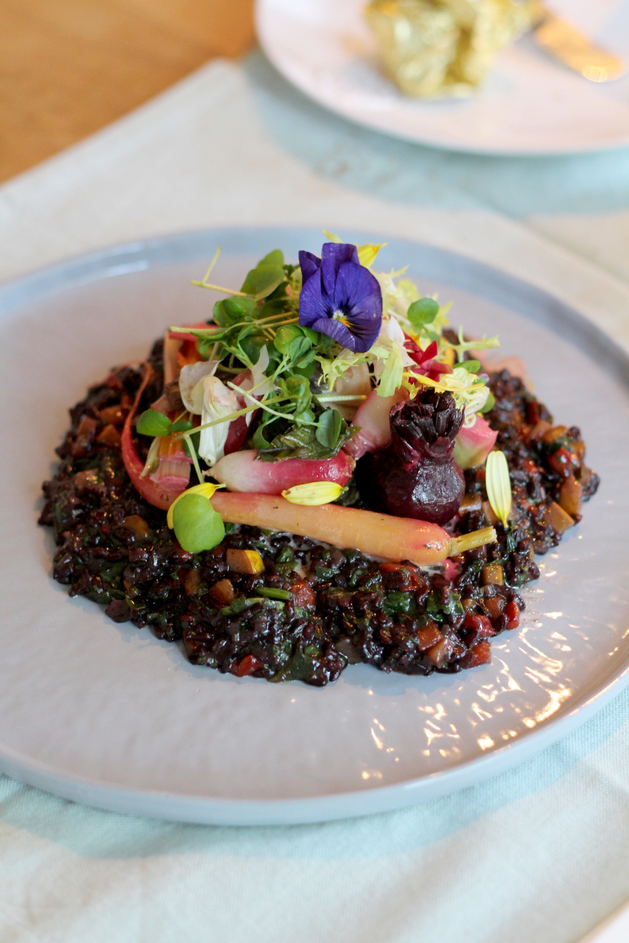 Er zijn (momenteel) drie gerechten te bestellen: een zwarte risotto met lentegroenten (€ 32,50), Miral eend met aardappelmousseline en bosbiet (€ 45,-) en tarbot met kaffir-vanilleschuim, aardappelmousseline, wilde spinazie en gekonfijte citroen (€ 59,-)