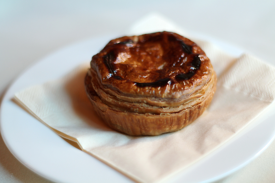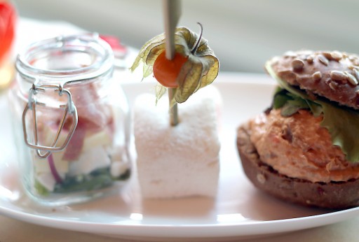 Vervolgens krijgen we ons eerste gerecht: een kleine warme English pie met kip en prei. Erg lekker, maar niet specifiek fashionable: dat is een minpunt. Daarna volgt een broodrolletje met gerookte zalm, een broodje tonijnsalade en een mini-salade met geitenkaas en ham in een amuseglaasje. En uiteraard scones met clotted cream en jam – de klassieker van de high tea.