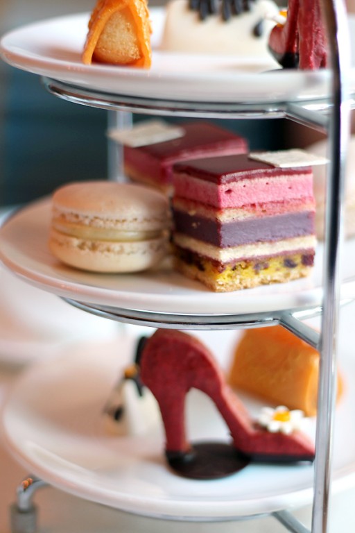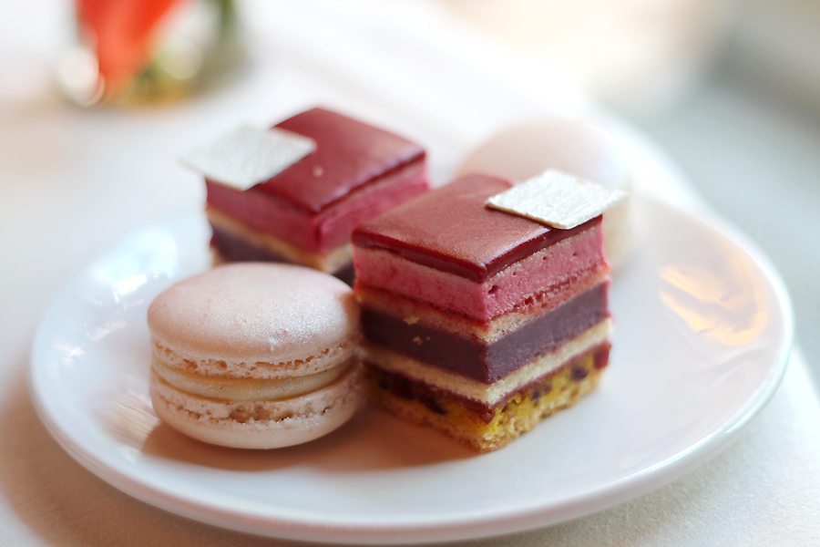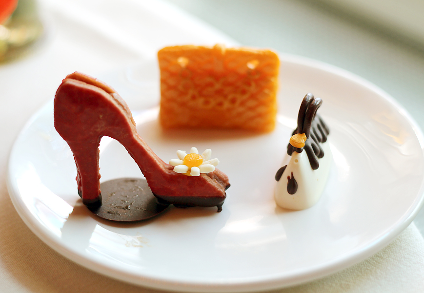 Dan is het tijd voor de modeshow – een culinaire show op tafel, that is. Een koekje in de stijl van Bette Midler’s kaneel-rode schoenen, een gouden Chanel 2.55 vanillecake met marsepein, een zwart Moschino-tasje van fondant, een gelaagd fruitcakeje met frambozen in de stijl van Dior Pink en een macaron met vanillecrème (waarvan de link met een tas alleen niet konden vinden). De gebakjes worden echter niet in huis gemaakt, maar verzorgd door een externe horecapatissier. Wij waren persoonlijk niet zo’n fan van de smaak van de zoetigheden. Het zag er prachtig uit, maar de smaken sprongen er wat ons betreft niet uit: de macaron was bijvoorbeeld niet helemaal goed gebakken en nog niet ‘gaar’ van binnen. Het Chanel-tasje was zwaar en plakkerig met een dikke laag marsepein. Jammer, want de presentatie was fabuleus.
