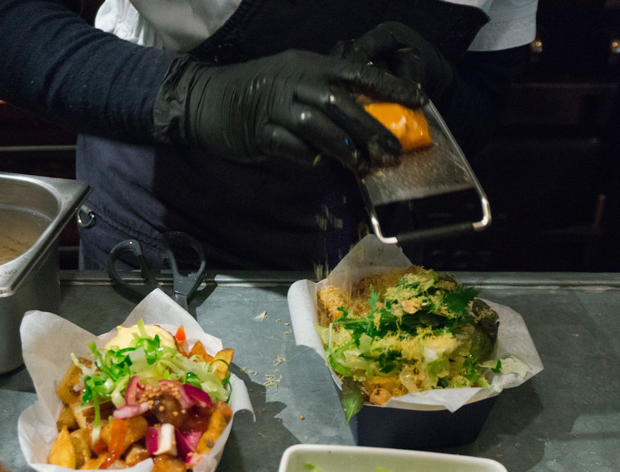 Op het frietje gaat eerst een salade van spitskool en mosterdblad en geroosterde hazelnoten uit Piemonte (Italië). Daarna huisgemaakte truffelmayonaise en tot slot wordt de Old Mimolette over het frietje heen geraspt. En véél ook.