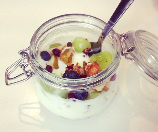 Homemade cocos-, cranberry & notengranola op basis van glutenvrije havermout met biologische yoghurt en vers fruit