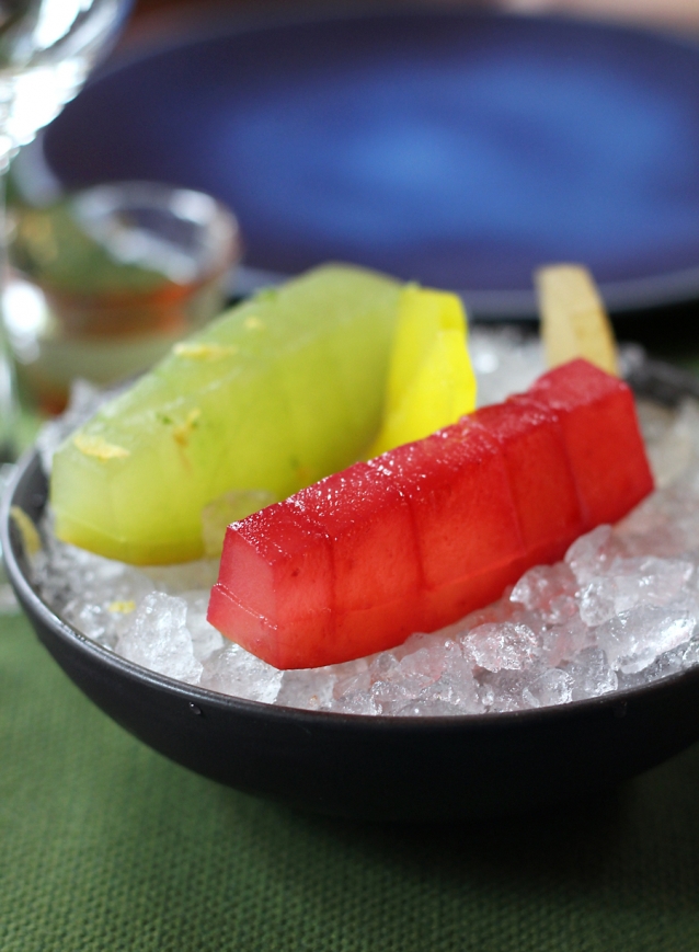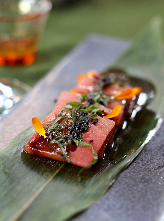 Sashimi van watermeloen met shiso. De ultieme combinatie van hartig en zoet-fruitig.