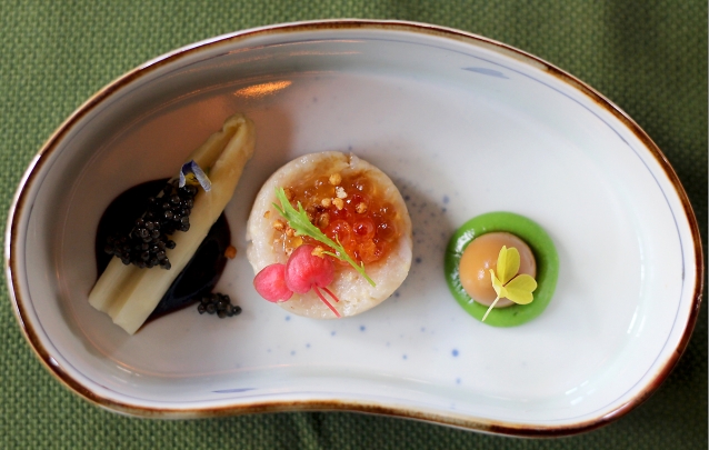 Een Bento-box à la Taiko. Met van links naar rechts: witte asperge met kaviaar, tartaar van hamachi (geelvinmakreel) en een nitamago kwartelei met miso. Allemaal spannend en lekker, maar het laatste hapje was onze absoluut favoriet: wát een smaak.