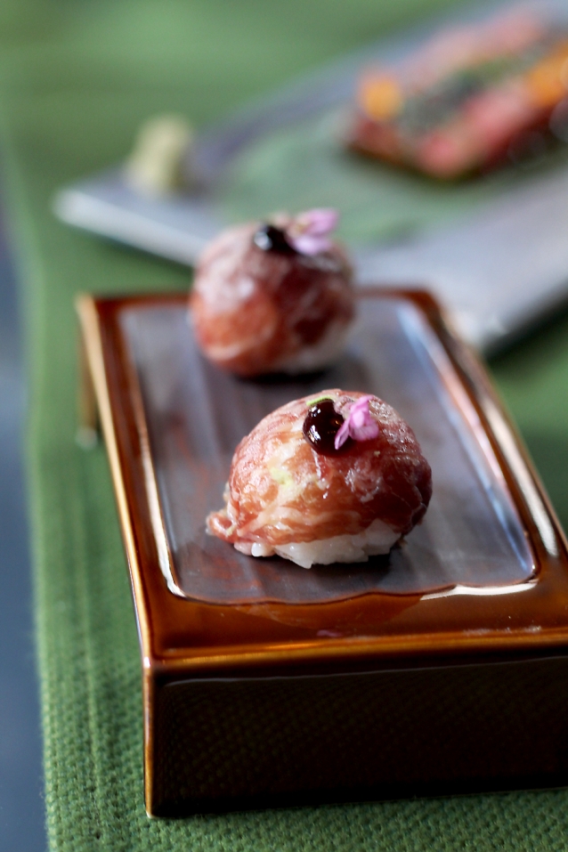 Temari sushi (een soort nigiri, maar dan in de vorm van een bolletje) met wagyu-ham en sakura-bloesem. Bijna zonde dat je het in één hap op hebt. Die ham…