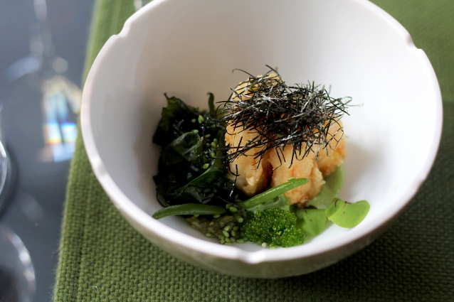 Crispy gefrituurde garnalen met verschillende structuren van wasabi en salty fingers. Pittig, zonder dat je naar de waterfles grijpt.