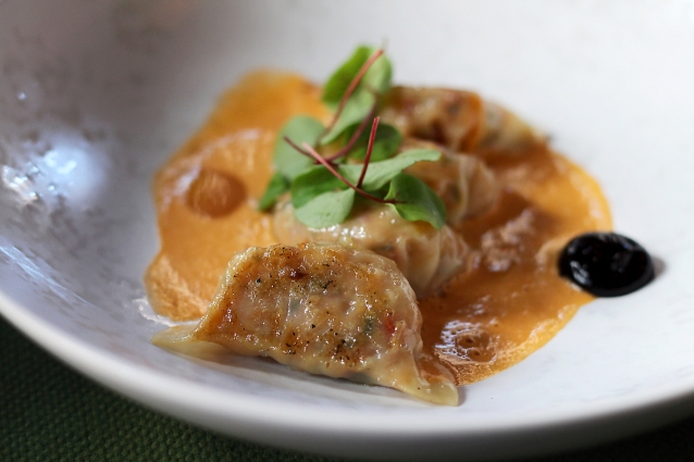 Gyoza gevuld met kreeft, geserveerd met kreeftensaus, miso en een crème van gepofte zwarte knoflook. Precies de goede balans tussen het zachte en zoetige van de kreeft en het stevige en knapperige van het gyoza-vel en de knoflook.