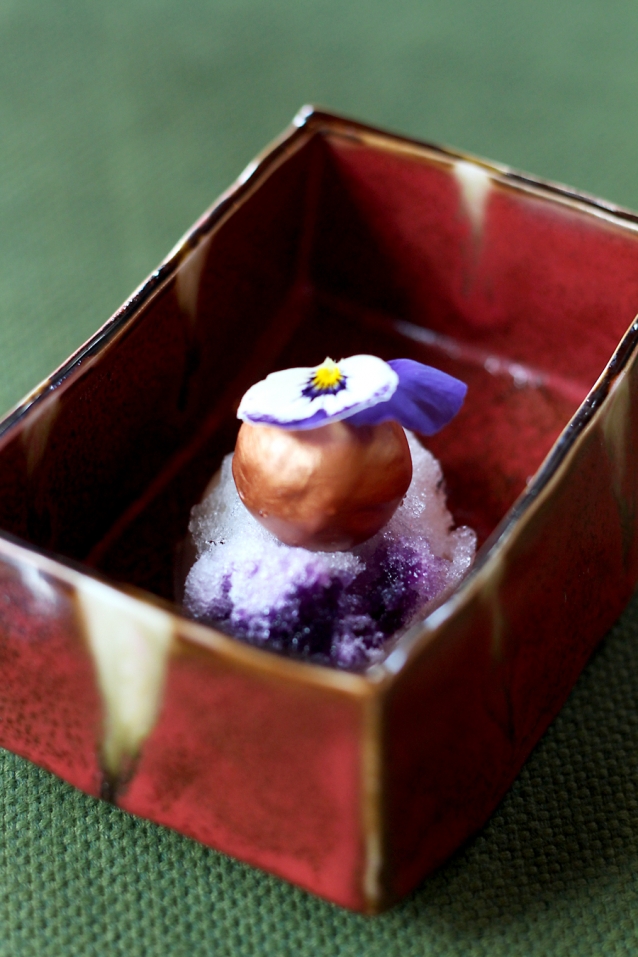 Het pré-dessert: kakigōri, oftewel Japans schaafijs, met umeshu, een Japanse likeur. Daaronder – bijna niet te zien op de foto – een amandel pannacotta met violetjes. Een apart dessert, omdat het geheel erg geparfumeerd is.