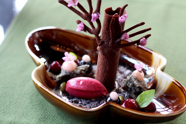Het spektakelstuk van het menu: de Cherry Blossom Chocolate Tree, met verschillende structuren van chocolade, kersenbloesem-sorbet en Amarena kersen. Dit nagerecht is onweerstaanbaar goed gemaakt; de chefs hebben 15 minuten nodig om elk bordje op te maken. Alleen dat al is een diepe buiging waard, maar de smaak was daarnaast ook uitmuntend.