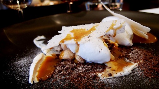 Margot Janse heeft een hangop gemaakt van de vrucht van de Afrikaanse baobab (ook wel apenbroodboom). De andere quenelle is kokossorbet. Erbij zien we macadamia en zelf mogen we voor de laatste klodders zorgen: een kannetje met gezouten honeybush caramel staat klaar.