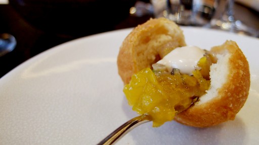 Het begint goed. We starten met een kommetje gevuld met radijs, piccalilly en olie. Een amuse die iedere gast bij RIJKS voorgeschoteld krijgt. Daarna gaat het speciale menu van start. ‘Vetkoek’ staat er bij het eerste gerecht. We hebben geen idee wat het is, maar laten ons graag verrassen. Margot vertelt dat het een Zuid-Afrikaanse versie van een oliebol is: gefrituurd witbrood. Erbij zit een tartaar van haring met chutney van limoen en champagne.